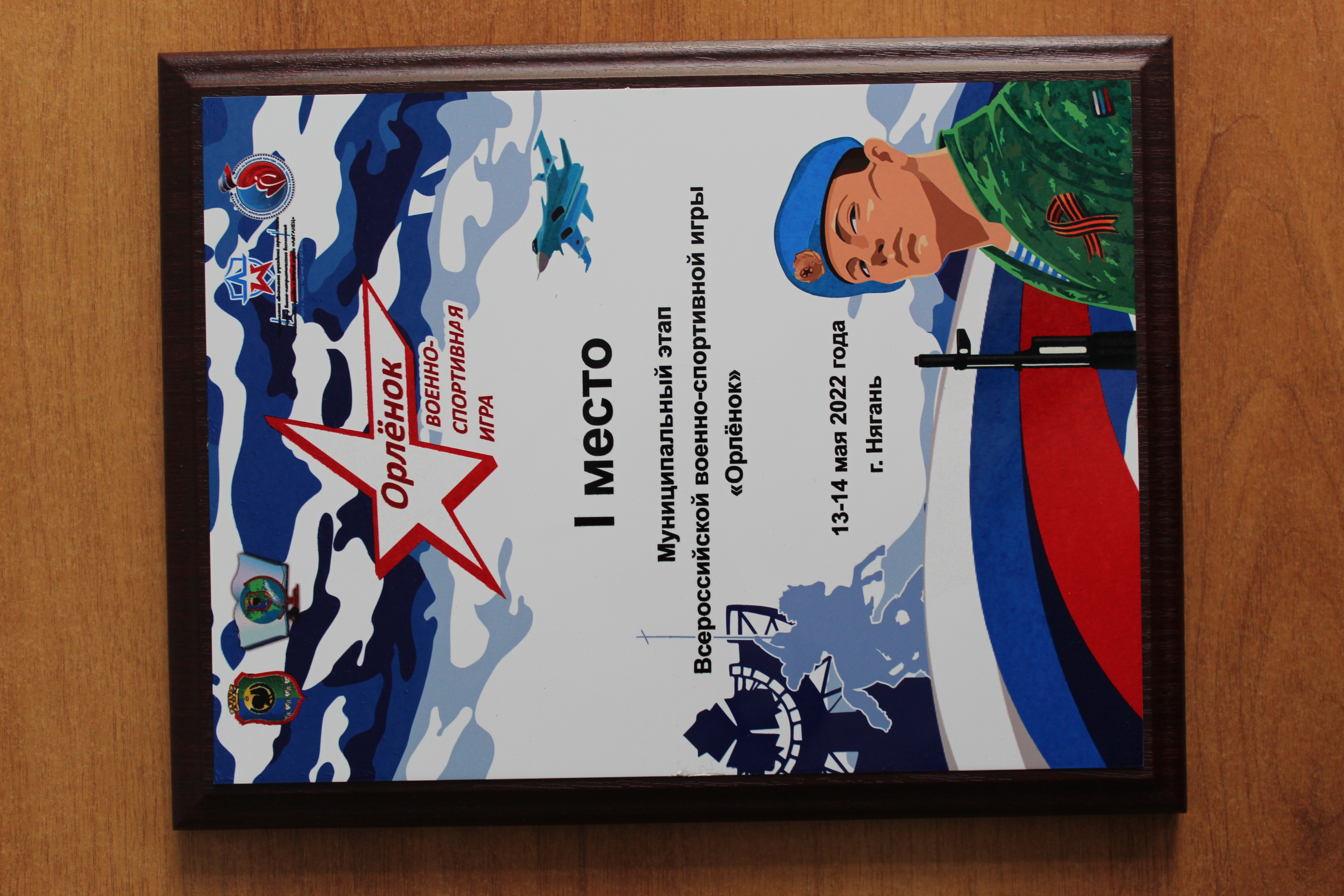 Плакетка команды МАОУ МО г. Нягань СОШ №14 за 1 место в муниципальном этапе Всероссийской военно-спортивной игры "Орленок"