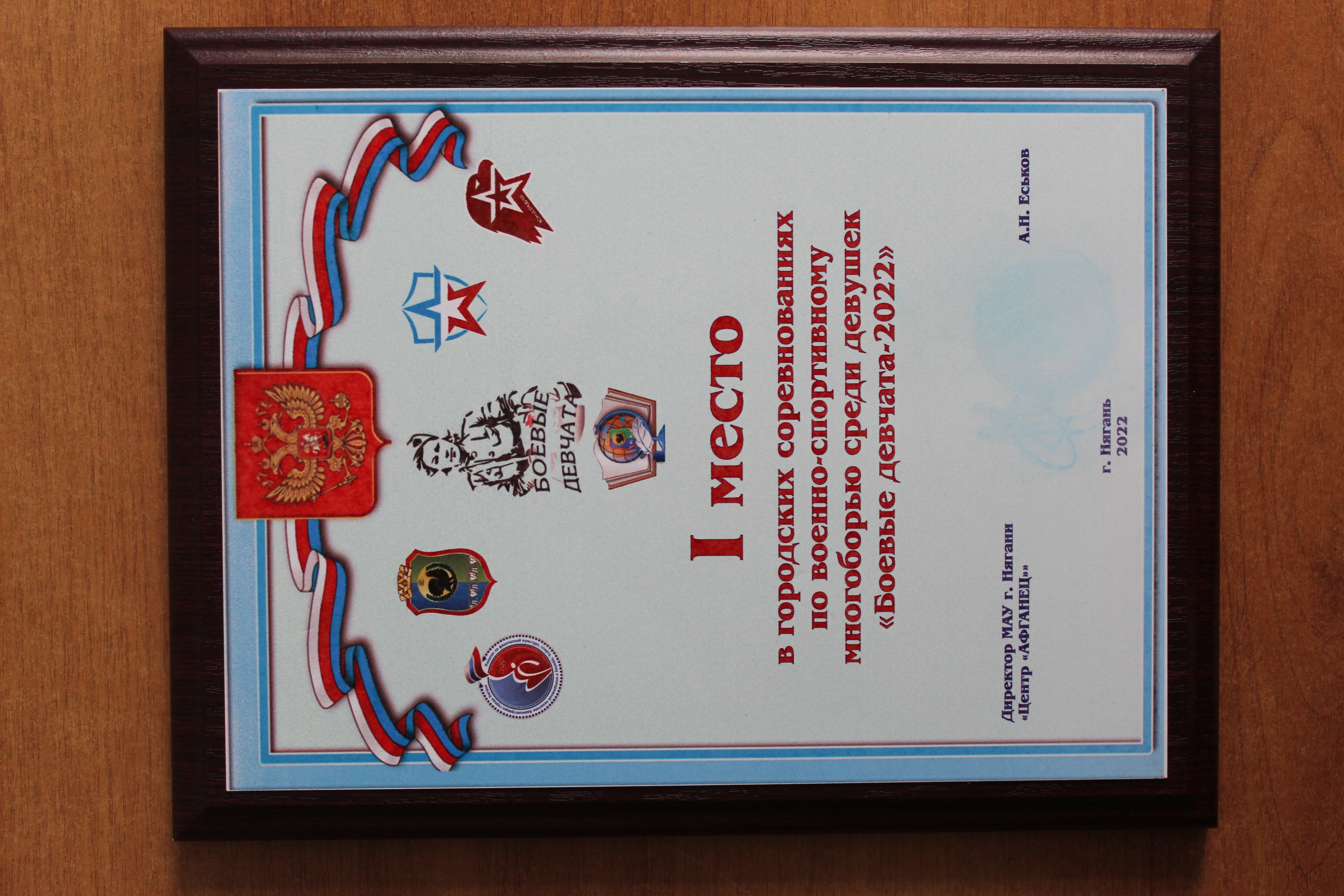 Плакетка команды МАОУ МО г. Нягань СОШ №14 за 1 место в городских соревнованиях по военно-спортивному многоборью среди девушек "Боевые девчата - 2022"