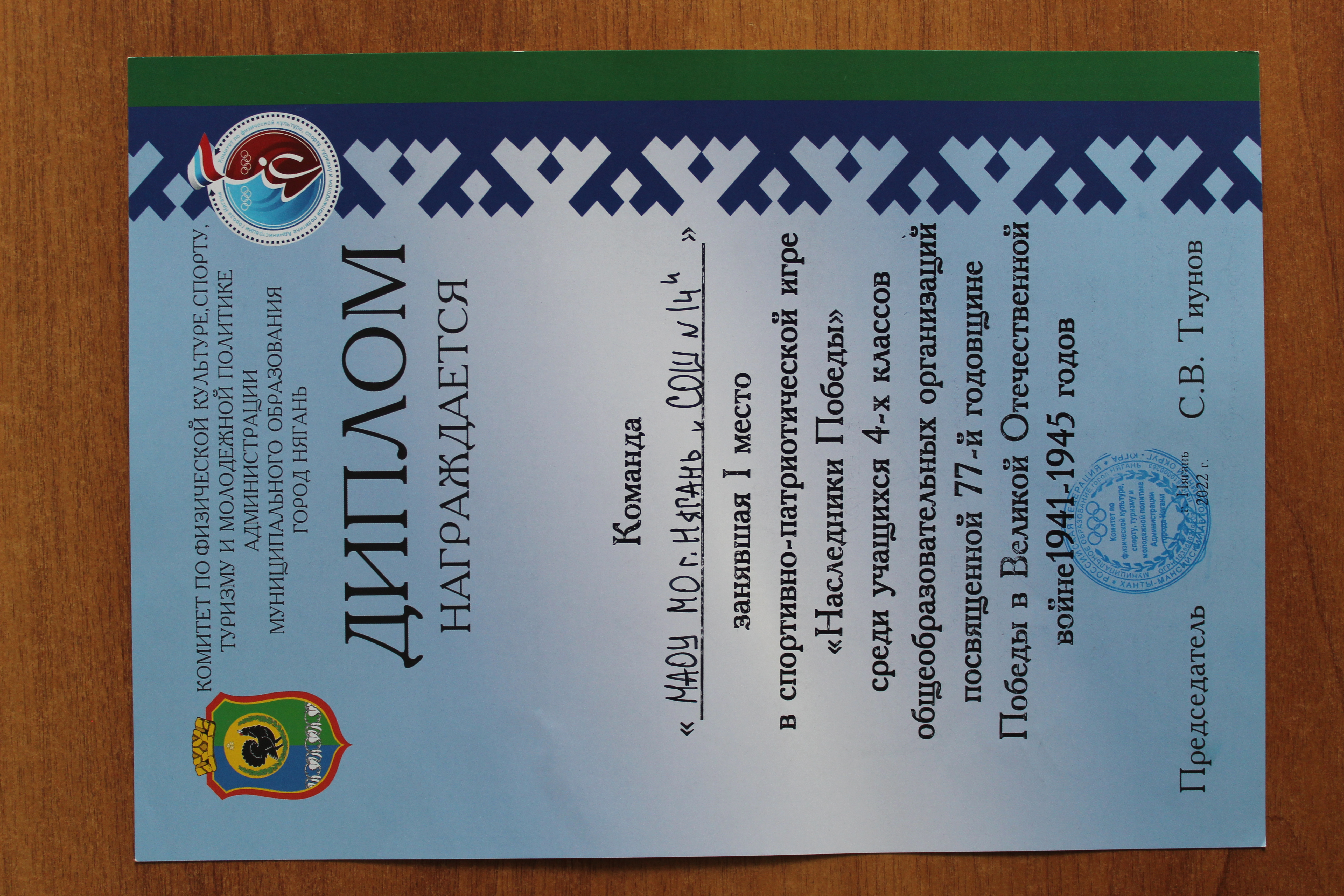 Диплом команды МАОУ МО г. Нягань СОШ №14 за 1 место в спортивно-патриотической игре "Наследники Победы" среди учащихся 4 классов общеобразовательных организаций посвященной 77 годовщине Победы в Великой Отечественной войне 1941-1945 годов