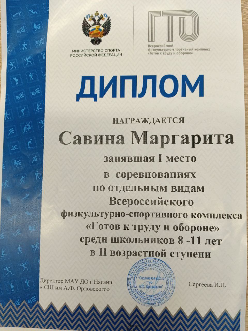 16-17 апреля в Нягани прошла городская спартакиада по ВФСК ГТО среди обучающихся школ начального звена (2-3 ступень). Савина Маргарита, ученица 3Б класса нашей школы, в данных состязаниях заняла 1 место ? В ближайшее время она будет готовиться к окружным соревнованиям, которые пройдут в Ханты-Мансийске. Поздравляем Маргариту и желаем новой победы! ???