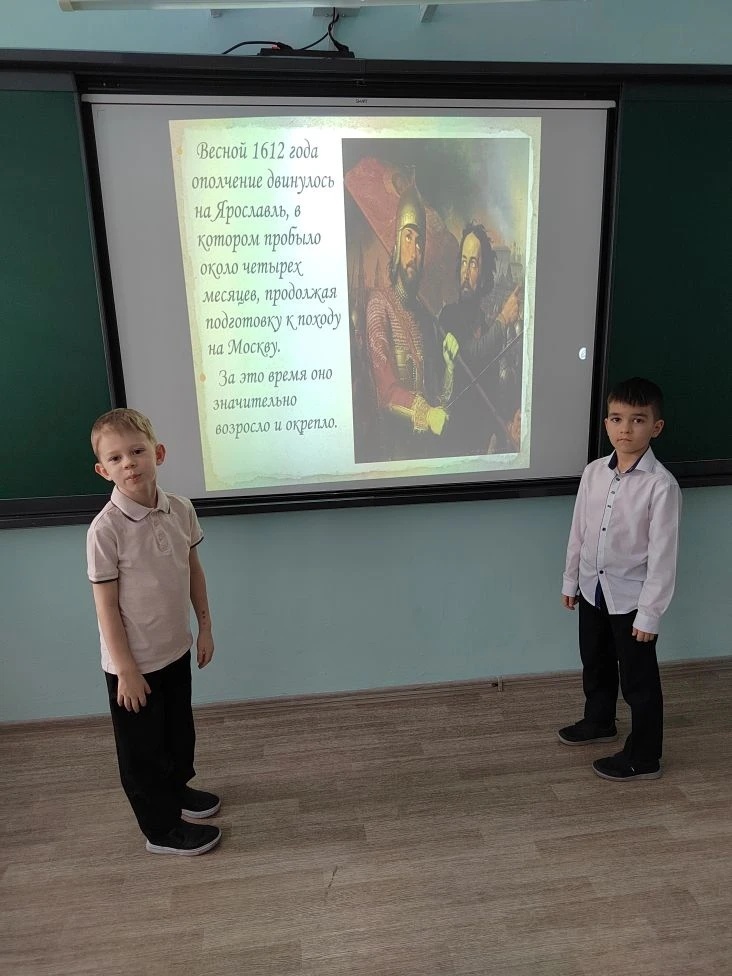 27 марта в 3Б классе нашей школы (СОШ №14) состоялось занятие по внеурочной деятельности "Яркие страницы истории нашего Отечества", которое перенесло учащихся в 1611 г. в "лихолетье". Ребята в документальном фильме увидели, как формировались отряды народного ополчения - добровольцы шли и шли. И уже Нижегородское войско превратилось в общерусское. Минин и Пожарский - торговец и князь были объеденены одной целью: любовью к своему Отечеству и желанием освободить Русь от поляков. Фильмы, презентация, чтение отрывков из летописи - донесли до детей, что только вместе объединившись, тесно сплотившись перед лицом опасности, можно спасти свою землю от иностранного порабощения. Учащихся впечатлил памятник "Гражданину Минину и князю Пожарскому благодарная Россия", установленный в 1818 г. на Красной площади на средства простых людей.